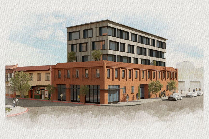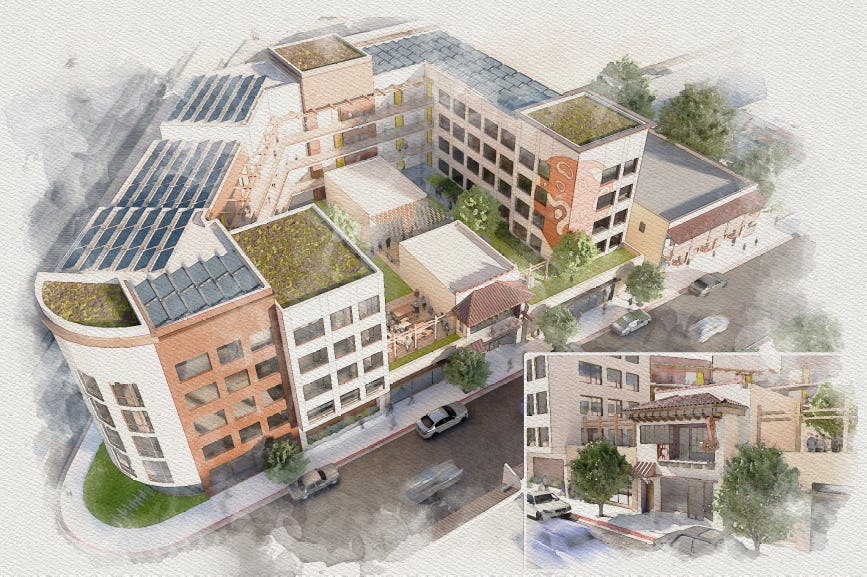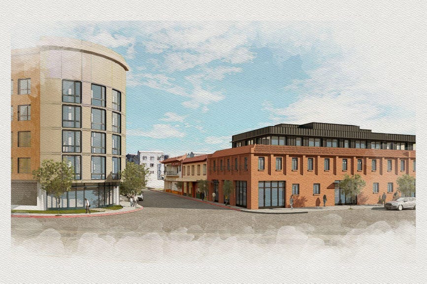 Pre-design Work for 45 Soledad Street (Republic Hotel, see image above). TEF Architects also began potential design concepts for the City-owned lot at 45 Soledad Street. They presented two designs that tried to replicate the appearance of the old hotel red brick exterior with additional stories to increase capacity. Both 34-38 and 45 Soledad St. are designed as mixed use; with first floor businesses and upper floors as housing.
